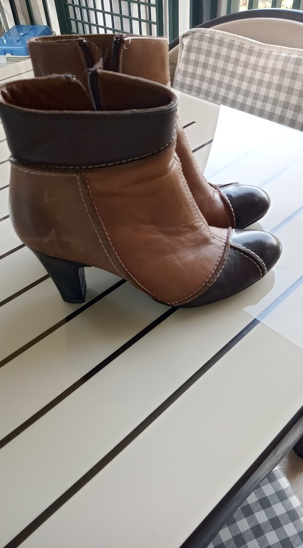 Kahverengi hakiki deri ve topuklu kadın botları. Koyu tonlu, desen içermeyen ve günlük kullanıma uygun Paris tarzında. taba ve koyu kahve rengi ile topuk boyu 8 cm bilek çapı 28 cm çok çok şık kaçırmayın derim