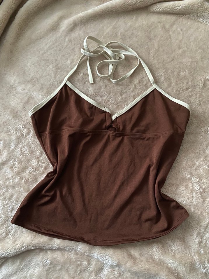 Yumuşak pamuk kumaştan, kahverengi halter yaka, kolsuz ve midi uzunlukta, vücuda oturan kadın tankini . Günlük sokak stili için rahat ve şık.mayo bikini üst