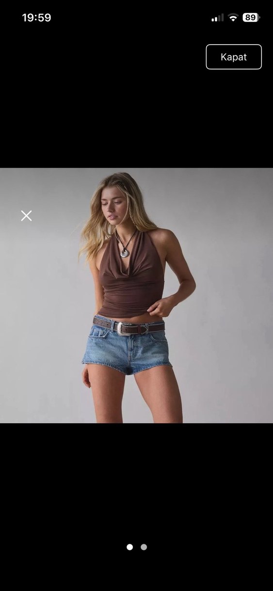 Kahverengi denim kumaştan, halter yaka ve ince askılı, vücuda oturan kısa crop top. Günlük kullanım için şık ve rahat bir seçenek.
