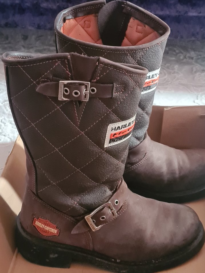 Kahverengi deri biker kadın botları, tokalı kayışlar ve yüksek topuklu, kapitone detaylı ve Harley-Davidson logolu.