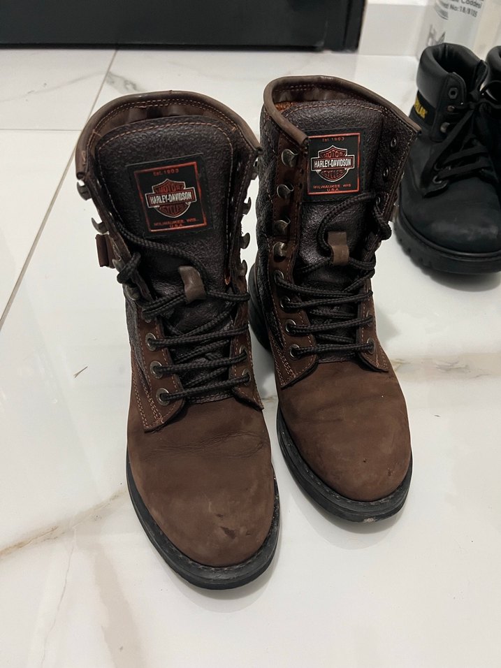 Harley-Davidson marka 36 numara (normal botlarda 37 giymeme rağmen çok rahat oluyor) kahverengi deri, tokalı biker botlar, yüksek topuklu ve desen içermeyen koyu renkte. Günlük kullanıma uygun, zaten kalitesini anlatmaya gerek yok, fotoğraflarda da gözüktüğü kadarıyla birkaç kusuru var ama asla su vs geçirmedi.