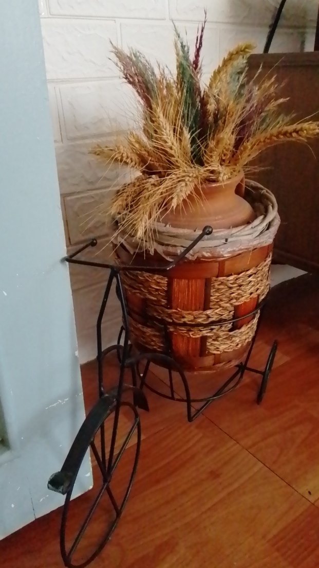 Hasır detaylı kahverengi vazo, metal üç tekerlekli stand üzerinde rustik bir hava katıyor.