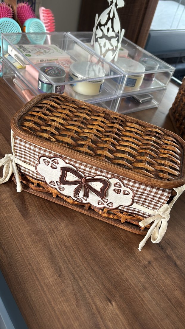 Kahverengi hasır sepet, kurdele desenli kumaş astar ve yan bağcıklarla küçük eşyaların düzenlenmesi için uygundur.
