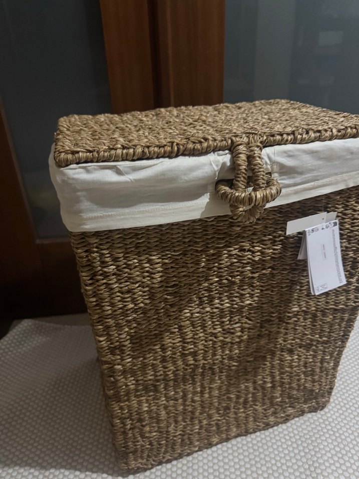 Gri kumaş astarlı, kapaklı kahverengi hasır saklama sepeti. Eşyaları düzenlemek ve depolamak için uygun.