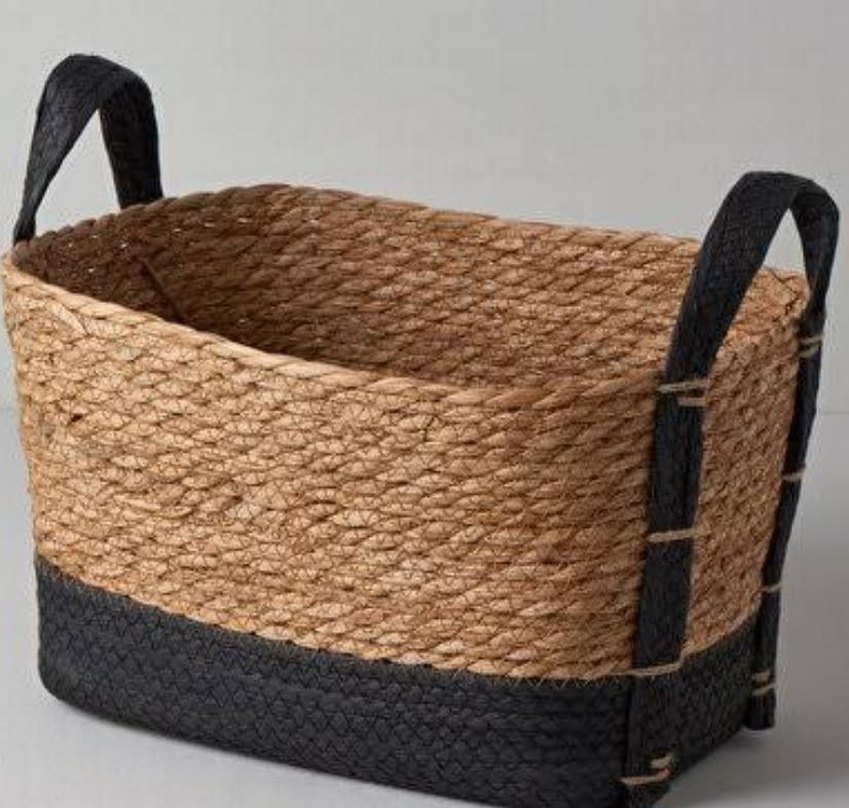 Koyu renk detaylı kahverengi dokuma sepet, çeşitli eşyaların saklanması için uygundur.