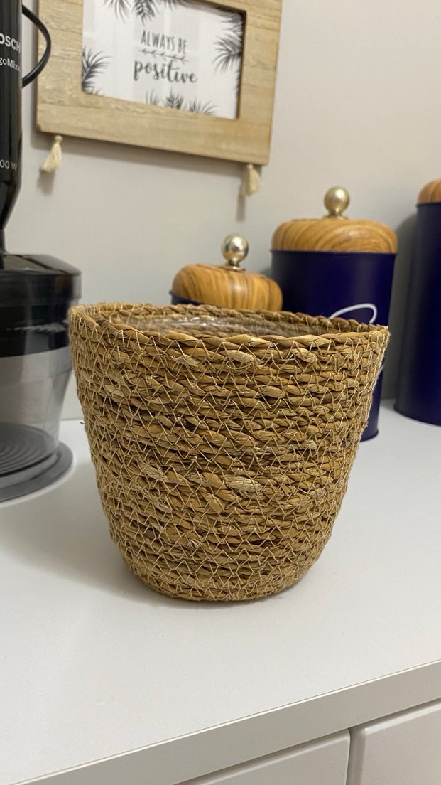 Küçük eşyalar için doğal dokulu, hafif kahverengi örme hasır sepet.