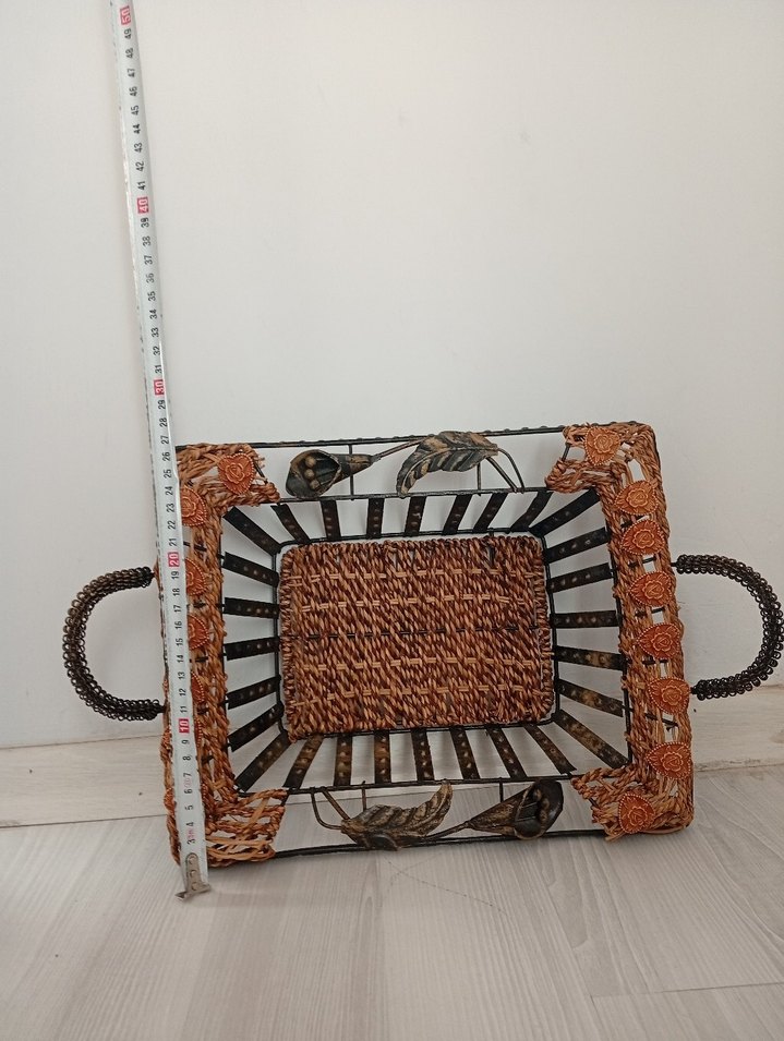Kahverengi hasır ve metalden yapılmış, kulplu ve çiçek desenli metal süslemeli sepet.