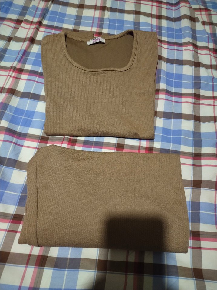 Açık kahverengi, kısa kollu ve yuvarlak yaka erkek ve kadın kullanılabilir kışlık pijama takımı, olarakda içlik olarak da kullanılabilir elastik ve yumuşacık