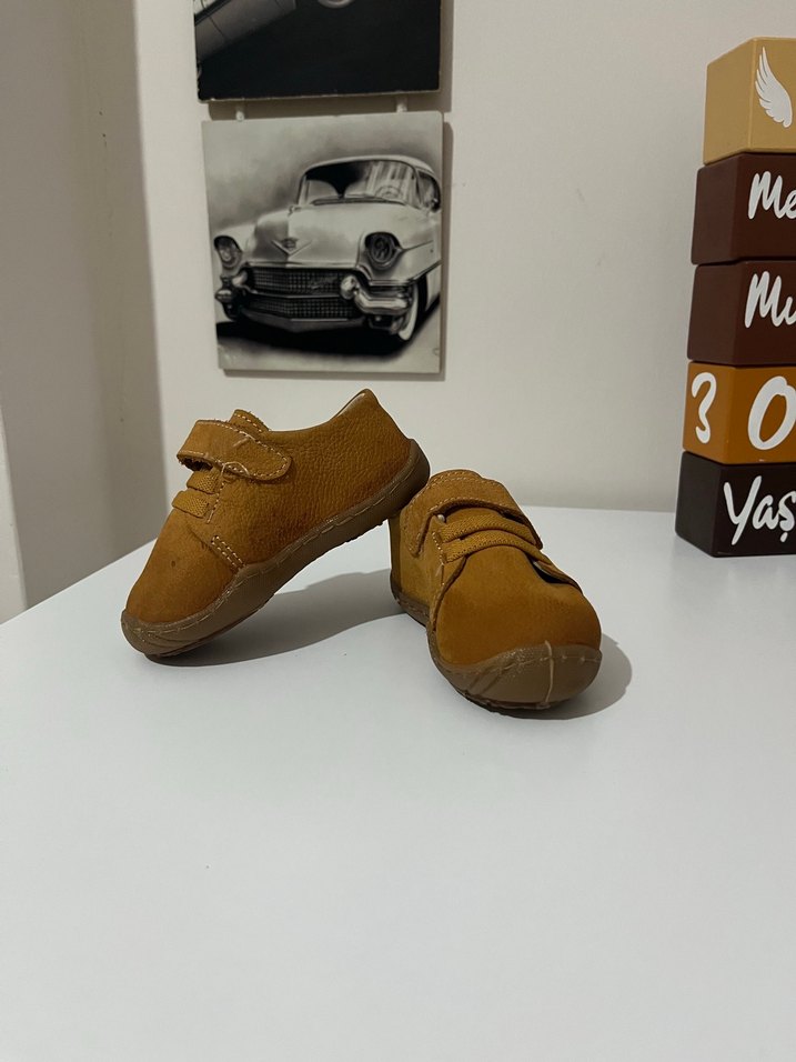 Kahverengi, parlak kauçuk tabanlı ve velcro bantlı sade erkek çocuk ilk adım ayakkabısı. Rahat ve günlük kullanım için uygun.