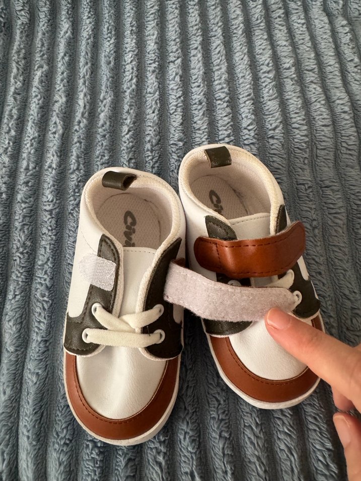 Kahverengi ilk adım ayakkabısı, Velcro bantlı ve gri tie-dye desenli, kauçuk tabanlı, trend sokak stili için uygun. Hiç kullanılmadı