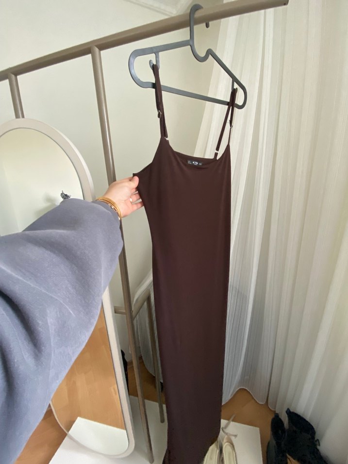 Kahverengi İnce Askılı Midi Elbise