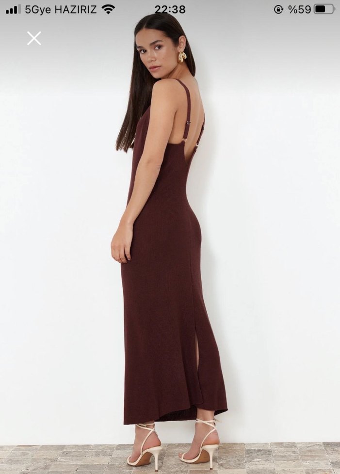 Kahverengi İnce Askılı Uzun Triko Elbise