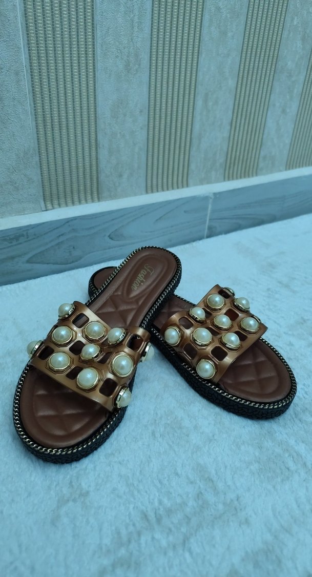 Kahverengi parlak dolgu topuk terlikler, inci boncuk detaylarıyla, kauçuk malzemeden üretilmiş, rahat ve günlük sokak stili için uygun.