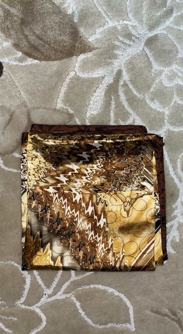 Drapeli, kahverengi, ipek görünümlü, koyu desenli bohem tarzda vintage esintili başörtü. Etiketsiz ve az kullanılmıştır