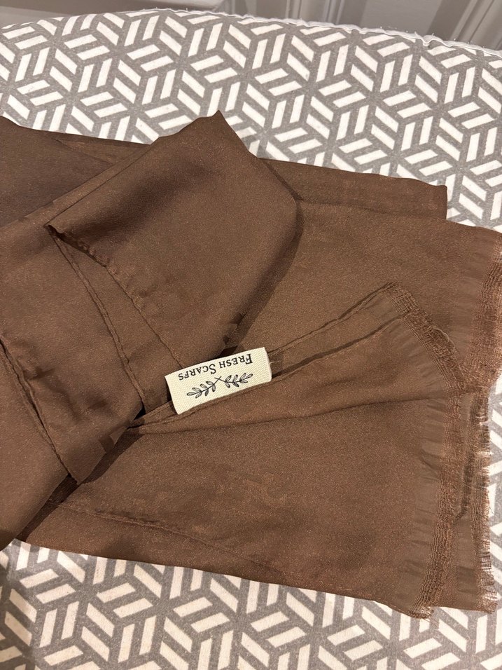Kahverengi, ipek görünümlü kadın şal, drapeli yapısıyla Paris ve bohem tarzını retro havasıyla birleştirir. Yumuşak ve pürüzsüz dokulu, hafif gri tonlar içerir.