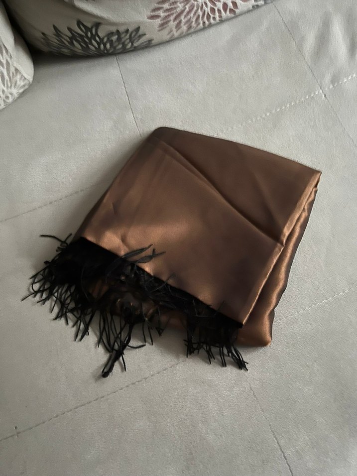 Koyu kahverengi, ipek görünümlü dokusu ve püsküllü uçlarıyla rahat bohem tarzı kadın şal.