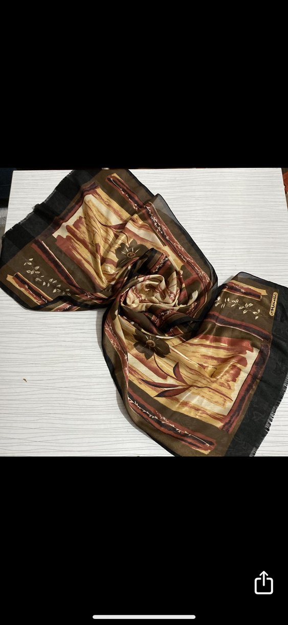 Kadınlar için ipek görünümlü, kahverengi tonlarında, bohem ve retro çiçek desenli, drapeli şal. 1.50 boy 50 cm en