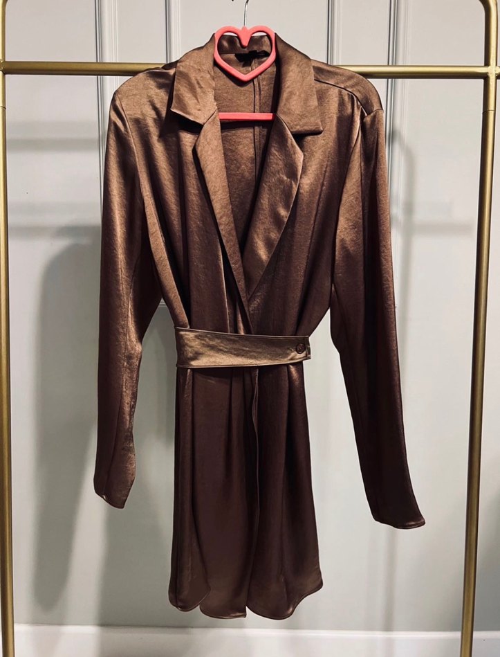 Kahverengi, ipek görünümlü kemerli v yakali elbise.Uzun kollu, regular fit,ofis hemde gece için uygundur. ✨