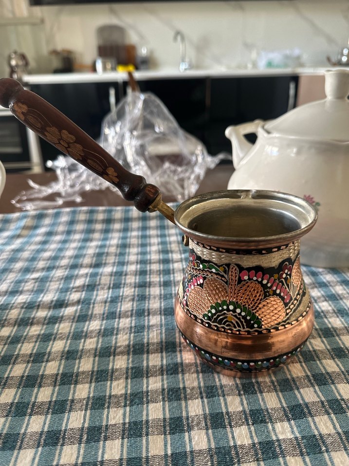 Ahşap saplı, işlemeli renkli desenlere sahip koyu kahverengi bakır cezve. Diyarbakır dan almıştım bakır çarşısından kahve yapmak için uygundur