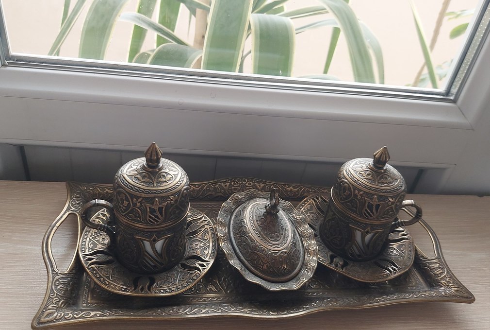 Kahverengi İşlemeli Bakır Kahve Fincan Seti