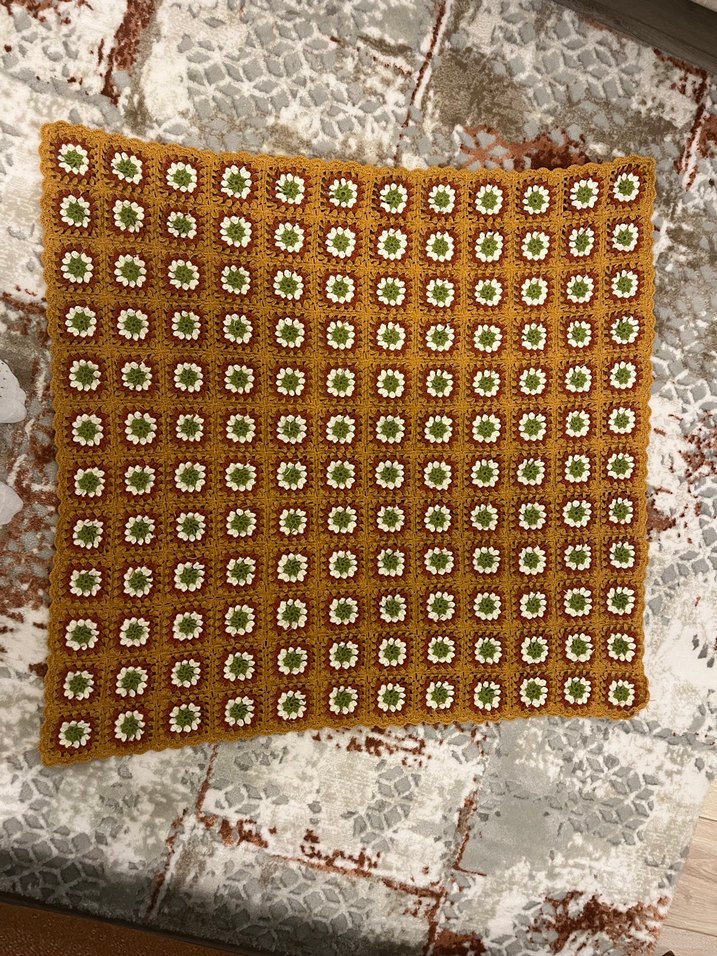Koyu kahverengi, beyaz ve yeşil işlemeli çiçek desenlerine sahip örgü battaniye. Yumuşak ve rahat dokulu, el yapımı. İstenilen renkte sipariş üzerine yapılır .