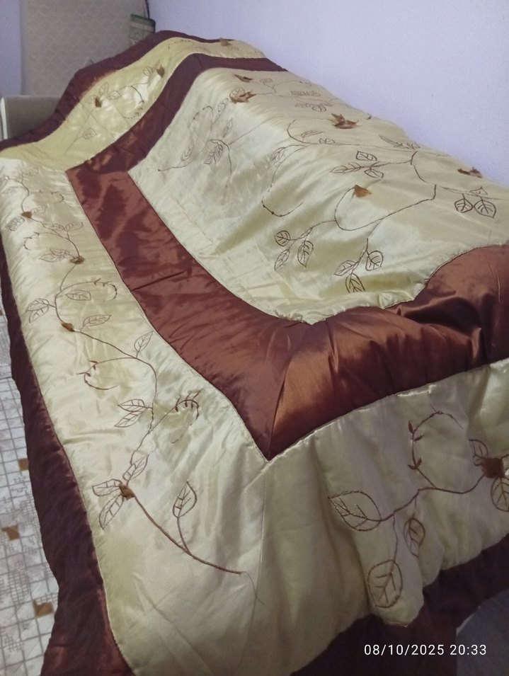 Kahverengi parlak yatak örtüsü, işlemeli yaprak desenleri ve yumuşak bir dokuya sahiptir. az kullanılmış temizdir