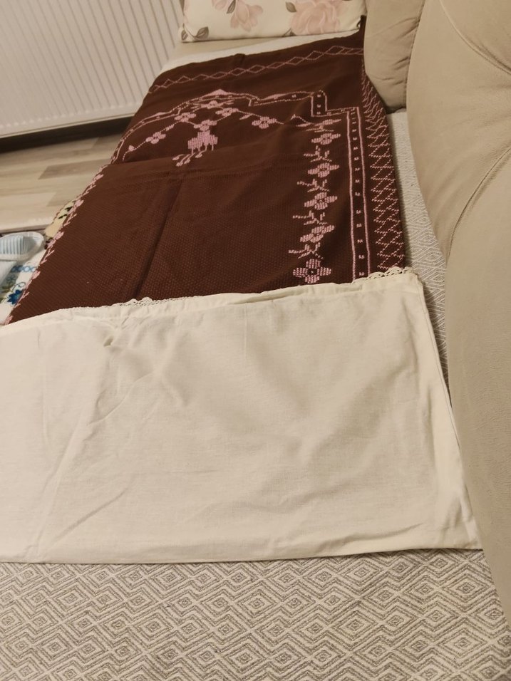 Kahverengi işlemeli yumuşak kumaş ve krem rengi kenar detayına sahiptir.