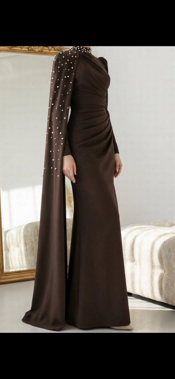 V yakalı, uzun kollu ve drapeli kahverengi uzun abiye elbise. İşlemeli detayları ve klasik kesimiyle düğünler için uygun. ✨