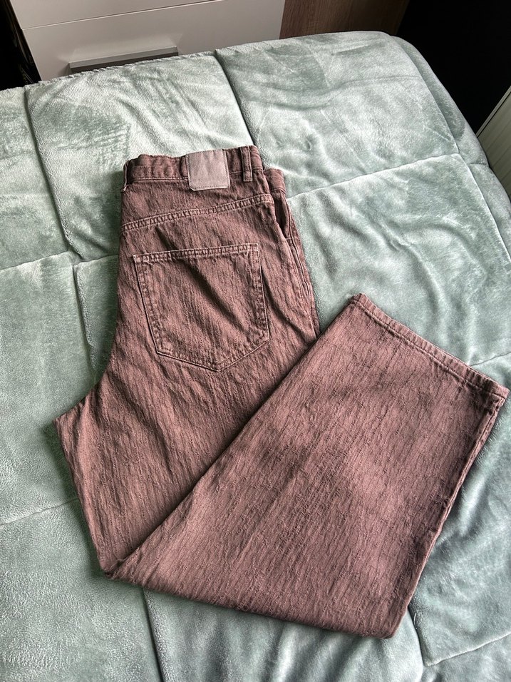 kahverengi jean, salaş kesim ve midi boyda. Günlük rahat sokak stili için zahmetsiz şıklık sunar.
