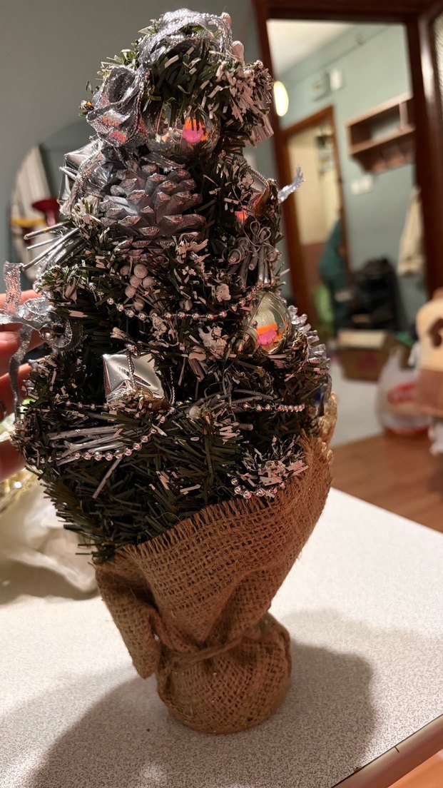 Kahverengi Jüt Kaplı Yeni Yıl Süslemeli Mini Çam Ağacı