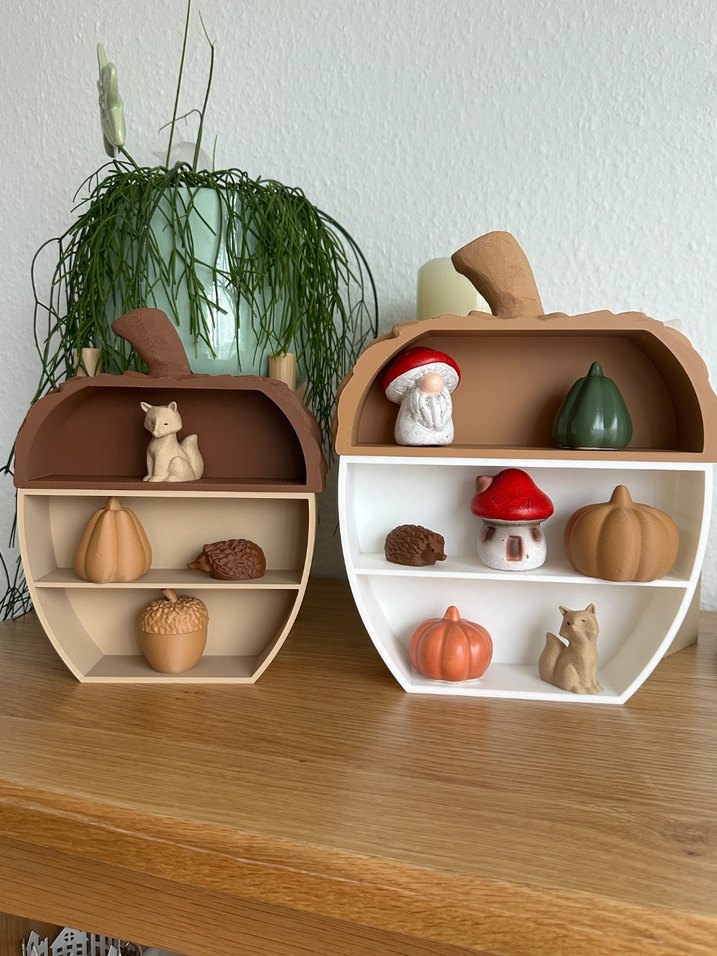 Kahverengi kabak şeklinde, küçük eşyalar için bölmeli çocuk rafları. Çocukların eşyalarını düzenlemek için uygundur.