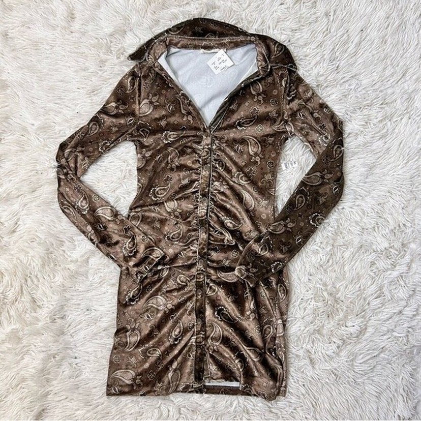 Kahverengi desenli, uzun kollu kadife kadın elbisesi. Stradivarius marka. 36 beden. Dar geldiği için hiç giyemedim.