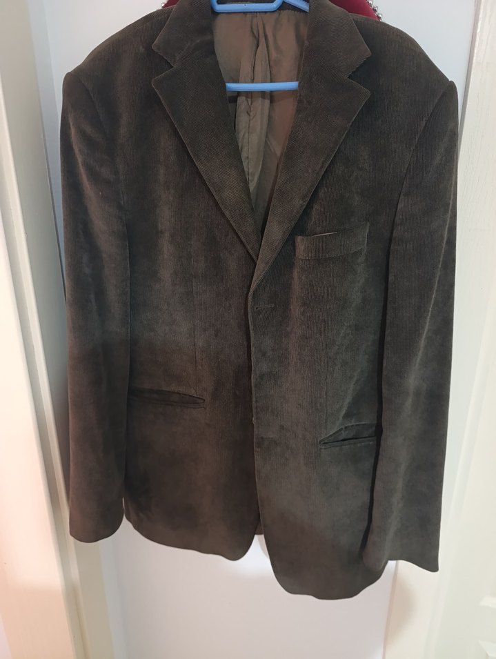Kahverengi kadife erkek ceket, kesik yakalı ve düğmeli ön tasarıma sahiptir. yalnizca iç astarında sökük var ceket sapasağlam.M- L bedene uyumlu