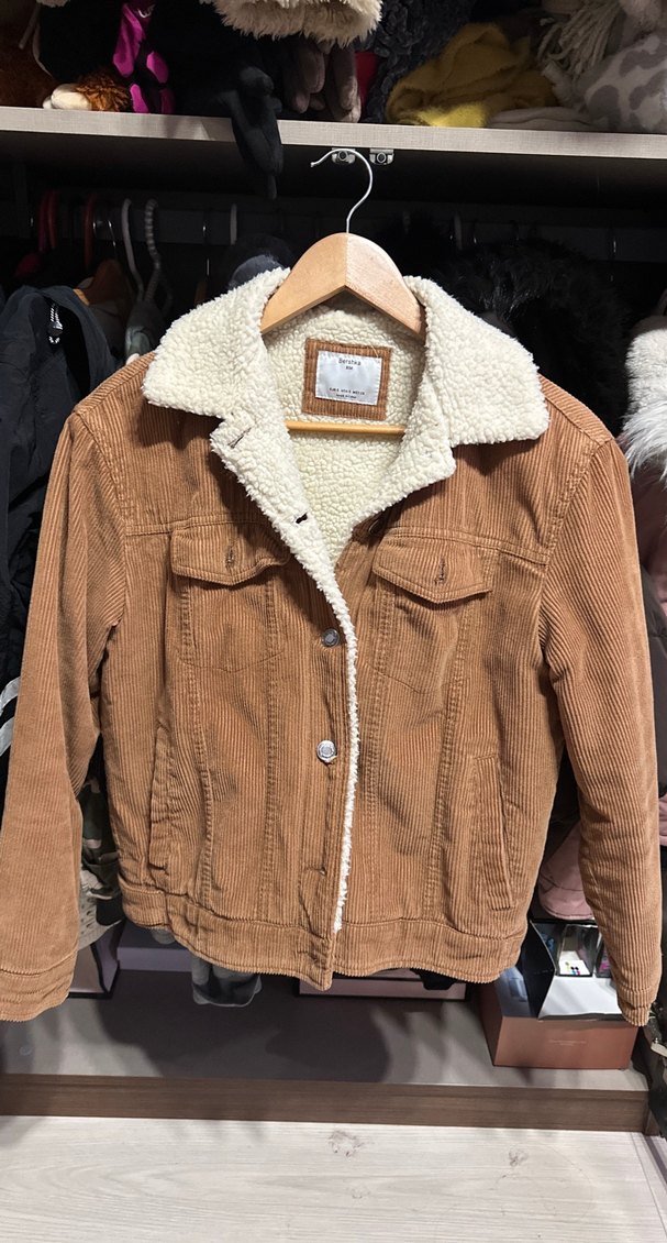 Kahverengi kadife kumaştan, kürklü detaylı, normal boy ve uzun kollu, fitted kesim kadın ceket. Rahat sokak stiline uygun.