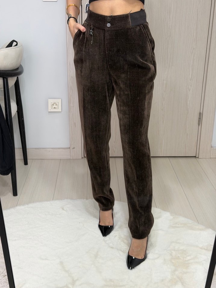 Kahverengi kadife kumaştan, kemerli ve regular fit kesime sahip midi boy pantolon. Desensiz ve günlük sokak stiline uygun, ofis kullanımı için ideal.