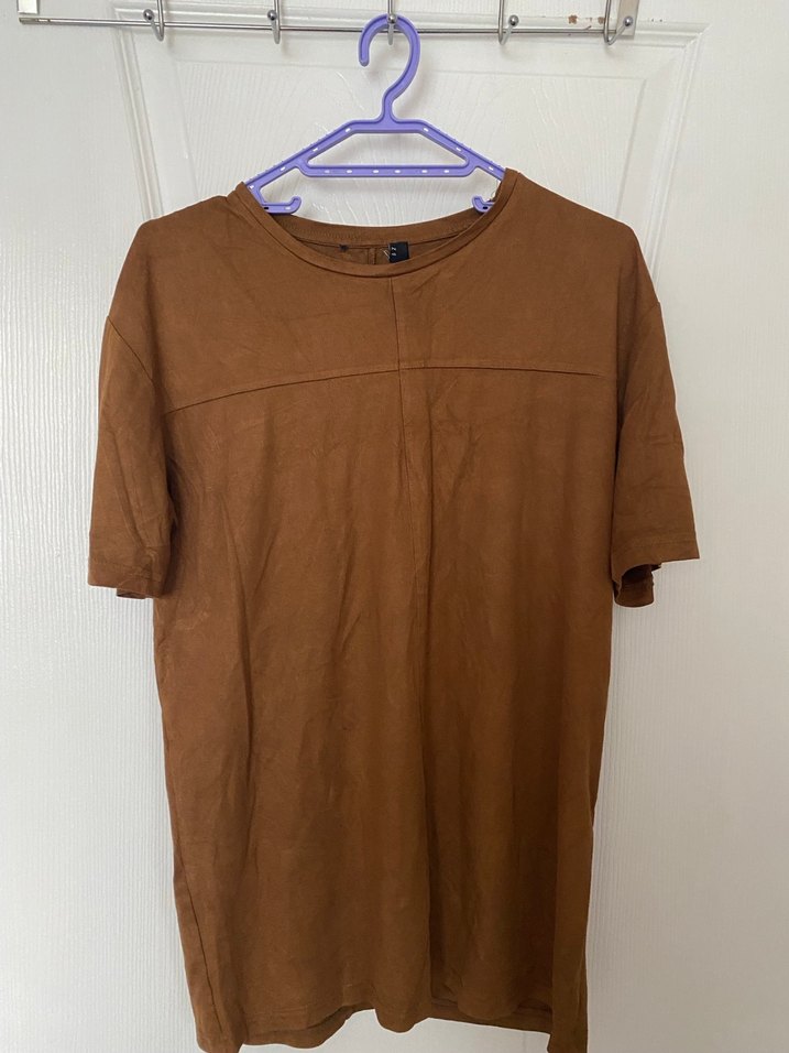 Kahverengi kadife kumaştan, kısa kollu ve yuvarlak yakalı ,Salaş kesim ve midi boyda, minimalist ve desensiz tarzda, günlük rahat kullanıma uygun.