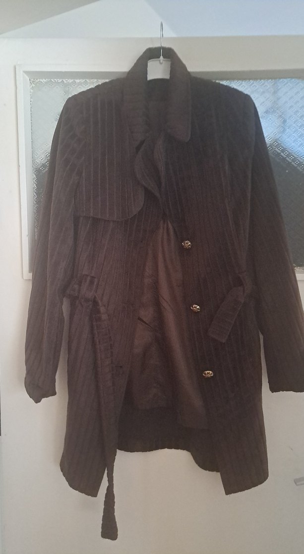 Kahverengi uzun hamile kaban, düğmeli ve kesimli yakaya sahip. Keten kumaştan, ofis kullanımı için uygun uzun kollu ve rahat kesim. Kaliteli vintage içi astarlı güzel ürün, l xl uyumlu