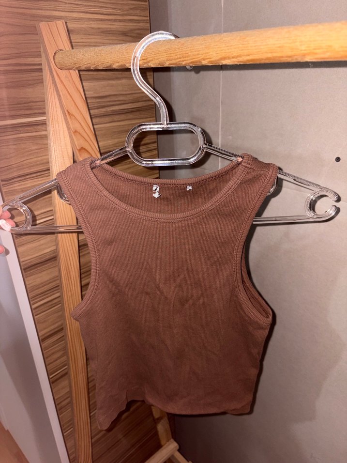 Kahverengi dar kesim kadın atlet. Minimalist ve günlük rahat sokak stili için uygundur. M-S beden