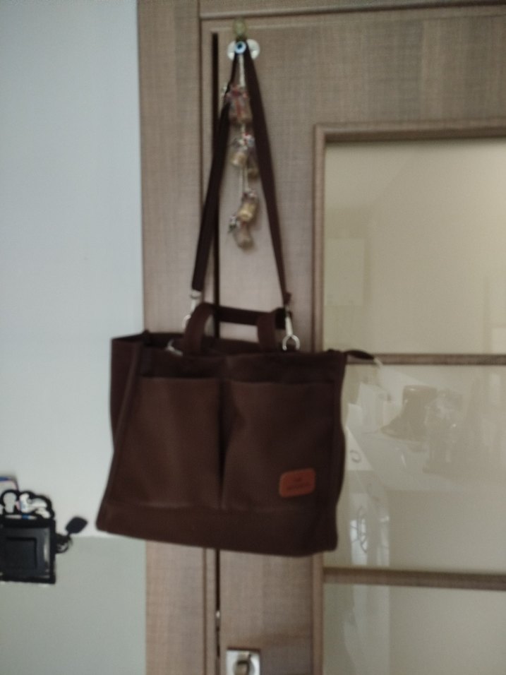 Kahverengi baskılı kadın çantası, omuz ve elde taşımak için çift askıya sahiptir.