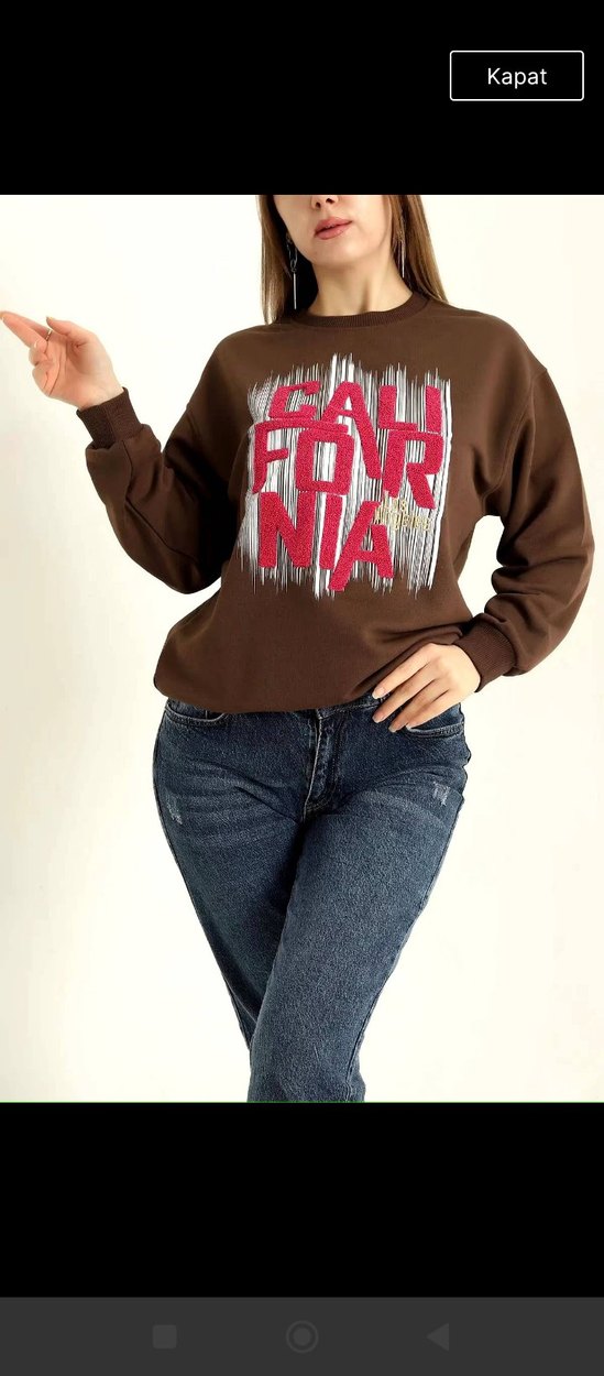 Salaş kesim, uzun kollu kahverengi sweatshirt. Yuvarlak yaka, baskılı 'CALIFORNIA' yazısı ve kürk detaylı, sentetik kumaştan.