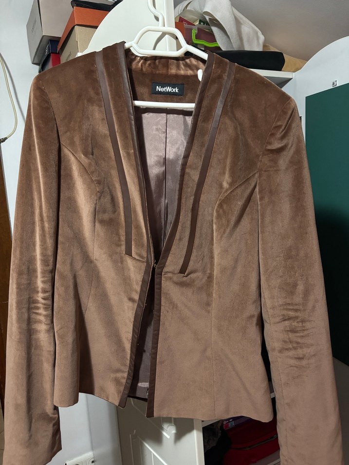 Kahverengi süet kumaştan yapılmış, düğmeli, notched yakalı kadın blazer ceket. Normal kesim, uzun kollu ve midi boydadır. Ofis için uygun, desen içermeyen şık bir tasarıma sahiptir. Belden oturan kadife ceket. Vintage bir havası vardır.