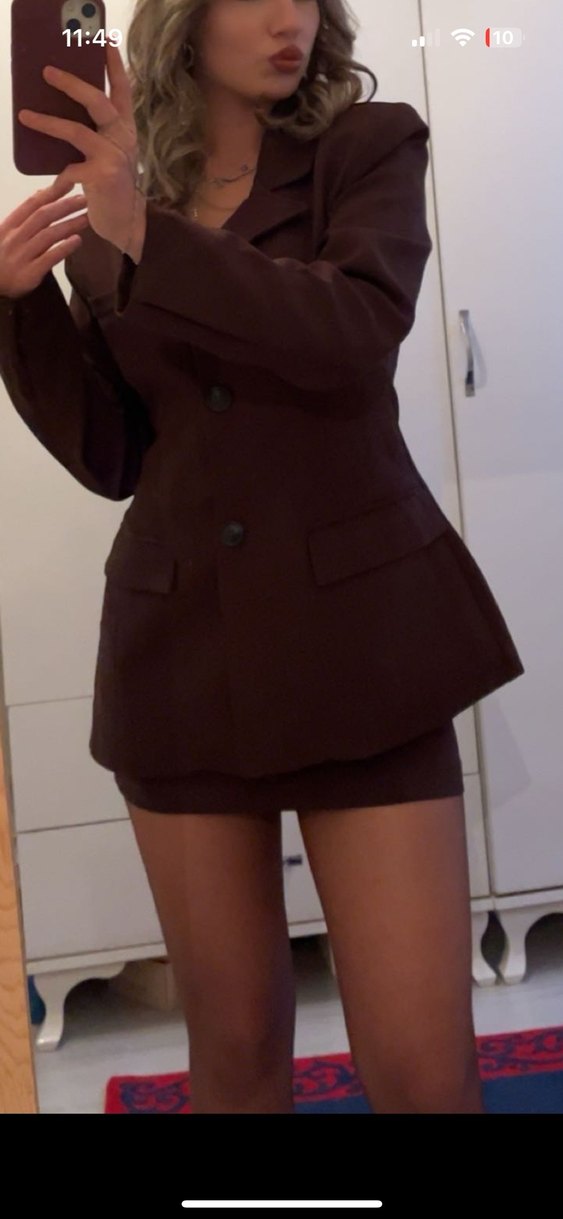 Kahverengi düğmeli belden oturtmalı ve kesimli uzun kollu midi blazer, ve mini eteği ile cesur ofis tarzı için notched yaka ile tasarlanmıştır. Ürünü bir kere özel bir gün için giydim yaka kısmında çok ufak deforme var ondan dolayı fiyatta düşüş sağlıyorum isteyen kişilere ürünün detaylı görsel ve videosunu atabilirim