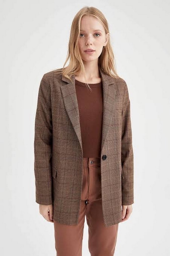 Kahverengi, normal boy, regular fit kadın blazer. Hiç bir kusuru yoktur. Yepyenidir. Aşırı oversize değil.