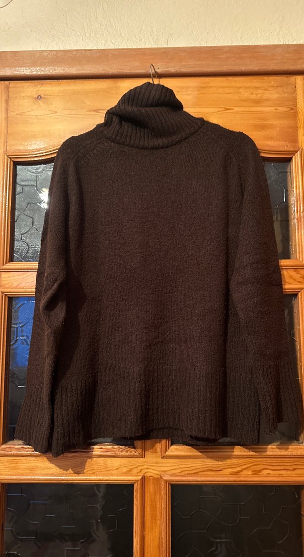 Koyu kahverengi, örgü dokulu boğazlı ve uzun kollu kadın kazak. Yumuşak yün kumaştan, bol kesim ve normal midi boyda, günlük kullanıma uygun sade model.
