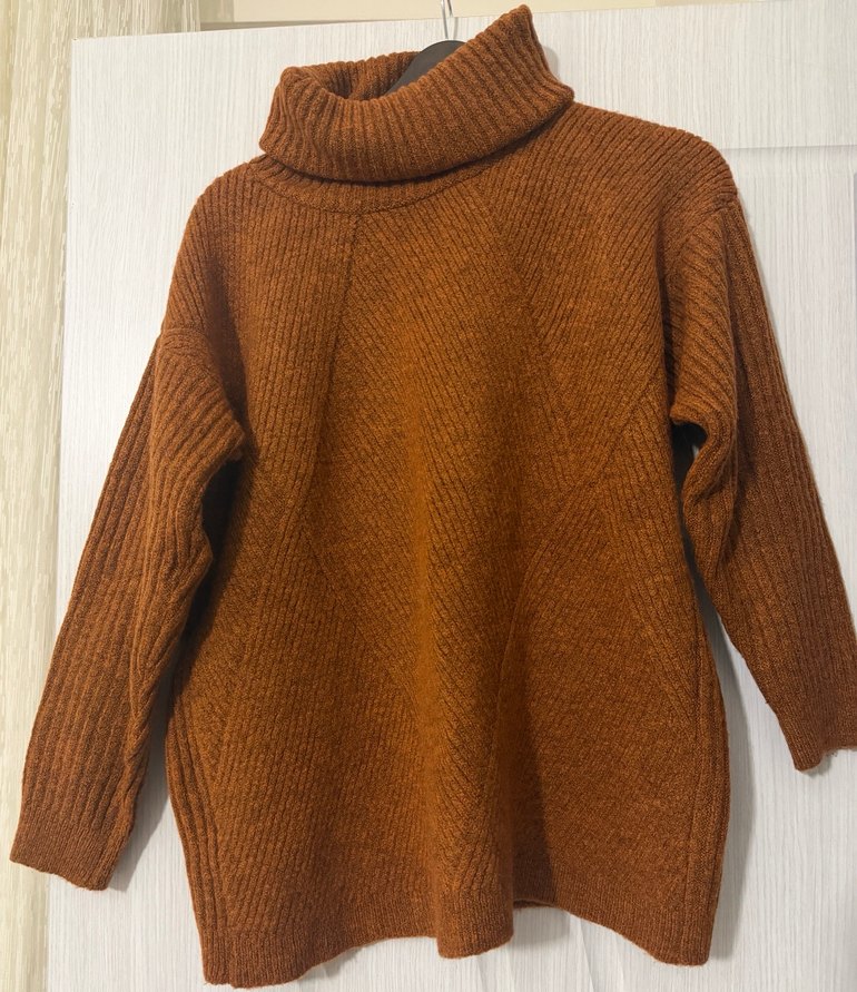 Kahverengi örgü yün kazak, boğazlı ve uzun kolludur. Rahat kesimi ve normal boyu ile sıcak ve modern bir görünüm sunar.