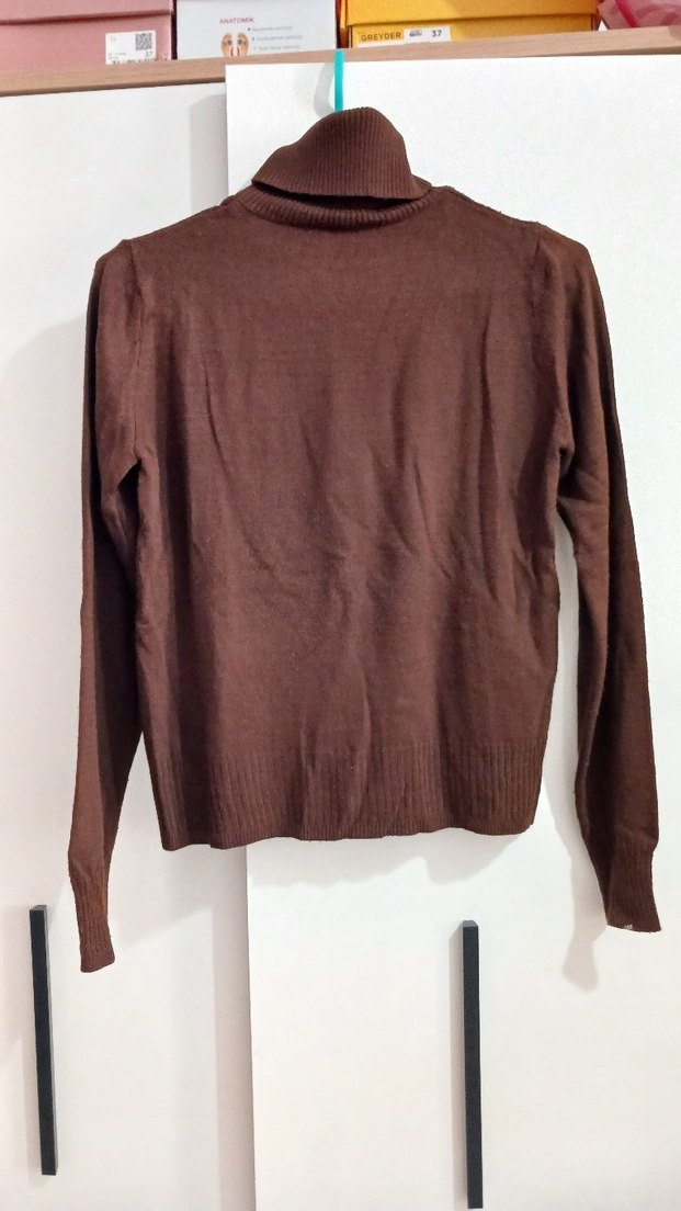 Bu kahverengi kadın kazak, boğazlı ve uzun kollu olup, yün örgü dokusuna sahiptir. Rahat ve sıcak tutan dokusu günlük sokak stiline uygundur. Düz ve sade tasarıma sahiptir. kolunda boya vardir görsellerde vardir.