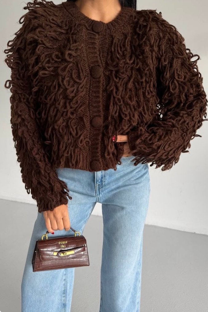 Kahverengi, tüy detaylı ve batik desenli salaş fitte örme hırka. Uzun kollu ve yuvarlak yakalı, sokak stili için uygun.