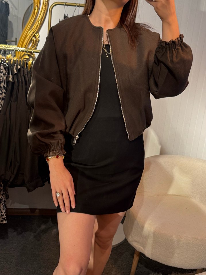 Kahverengi normal boy midi kadın ceket. Uzun kollu, bisiklet yaka ve rahat kesimle günlük sokak stiline uygundur.