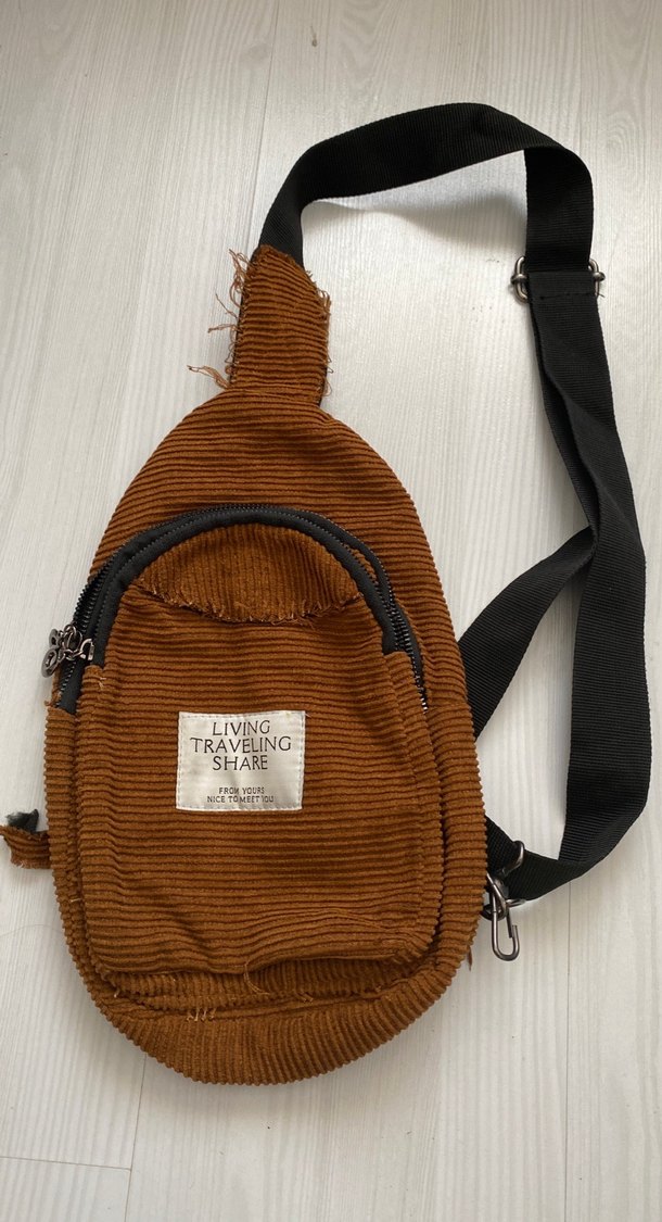Kahverengi çapraz çanta, tokalı askı ve baskılı sentetik kumaştan. Önde 'LIVING TRAVELING SHARE' yazısı bulunur. Rahat ve trend sokak stili için uygundur.
