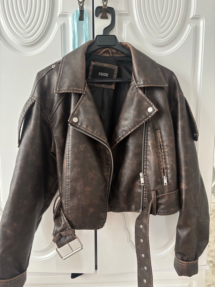 Bu kahverengi deri biker ceket, keskin yaka, tokalı detaylar ve askılı kollara sahip, trend şık görünüm için ideal.